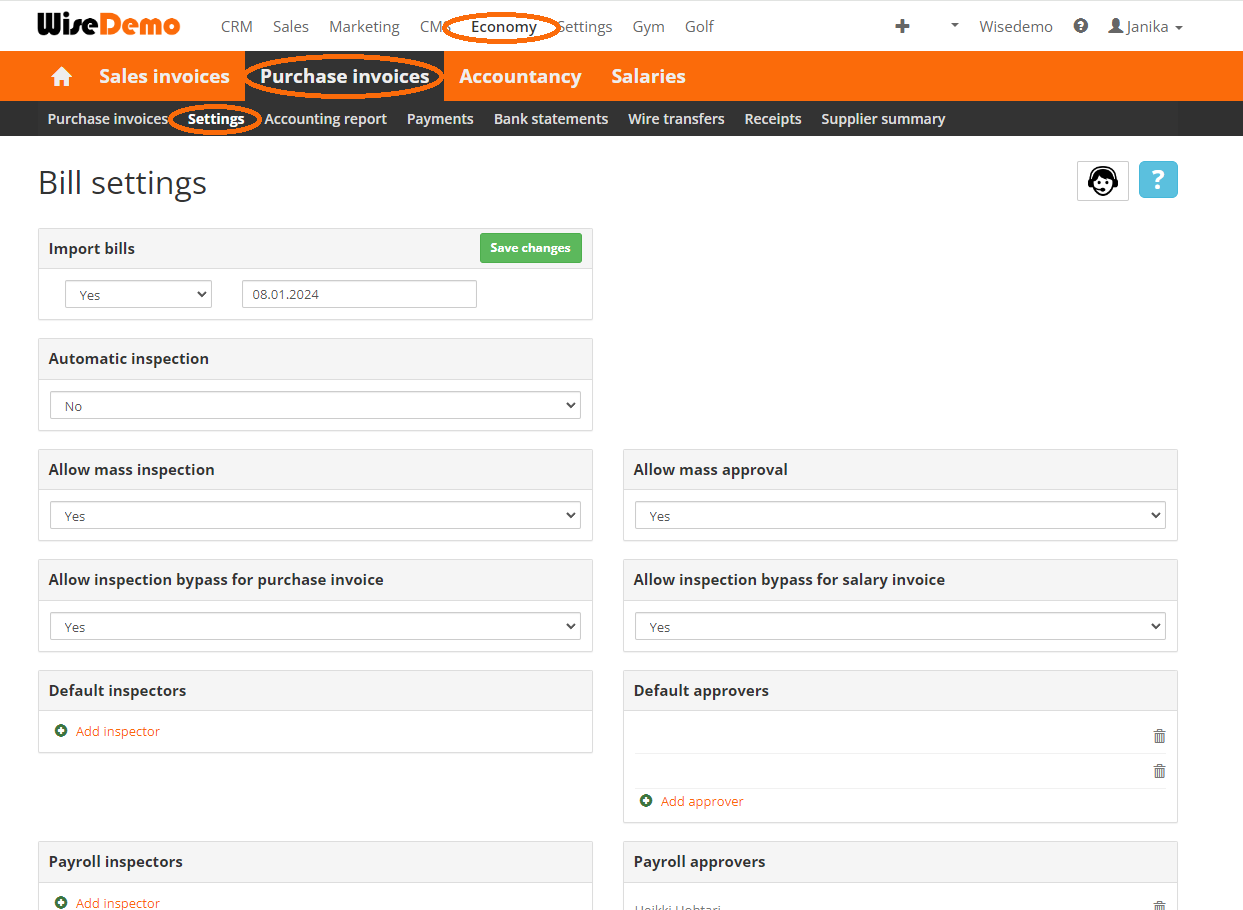 Purchase invoices' "Settings" tab allows configuring default inspectors and approvers for purchase invoices.
