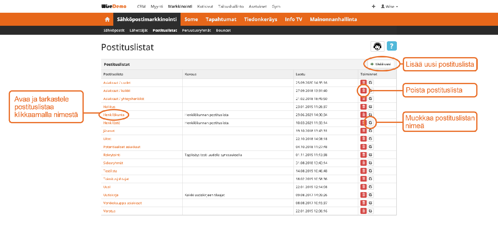 Postituslistojen pääsivulla voi tarkastella luotuja listoja sekä muokata niiden nimiä. Lisäksi postituslistoja voidaan lisätä tai poistaa tästä näkymästä.